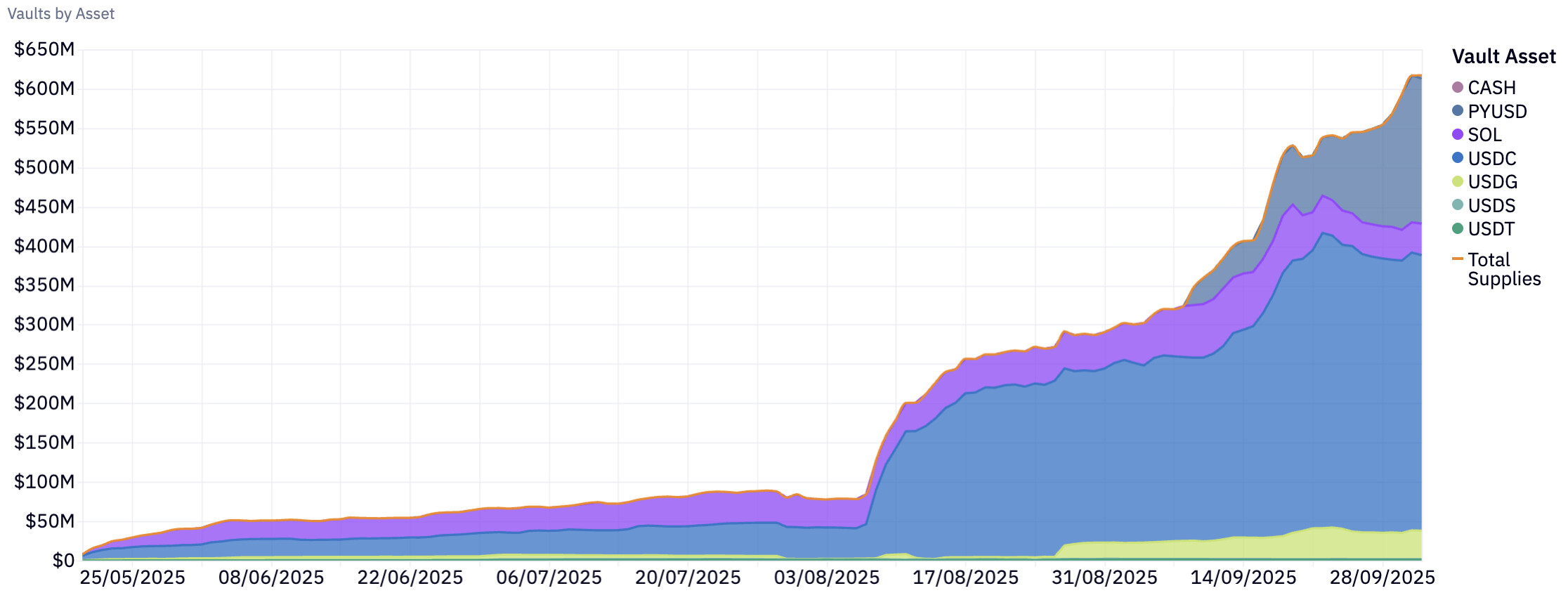 Kamino Lending Vaults continued to gain momentum in September, with deposits more than doubling to $593M (+200%). Stablecoin strategies led the way, highlighted by the rapid rise of PYUSD, which now accounts for 29% of all vault deposits, alongside continued strength in USDC-based vaults.